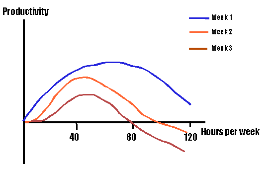 這位遊戲工程師就發現,他第一個禮拜能在約工作 60 小時的時候展現出最強的生產力,但是隨著時間拉長,生產力最佳的時數慢慢縮到了每週 40 小時,跟書中的數字如出一撤。